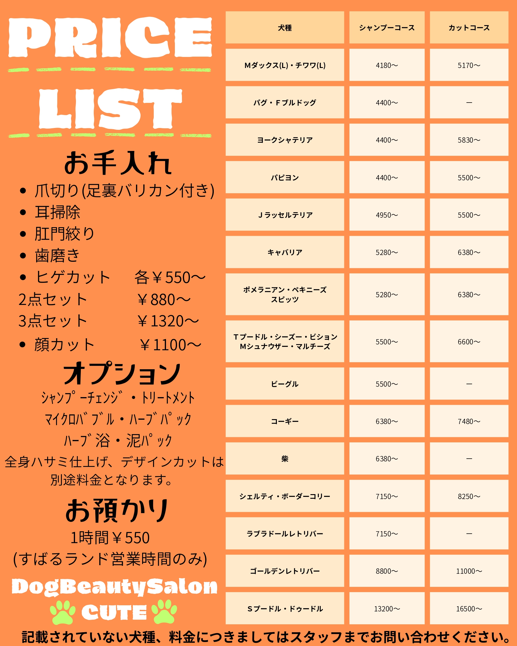 【ドッグビューティーサロンCute】サービス向上に伴う価格改定のお知らせ